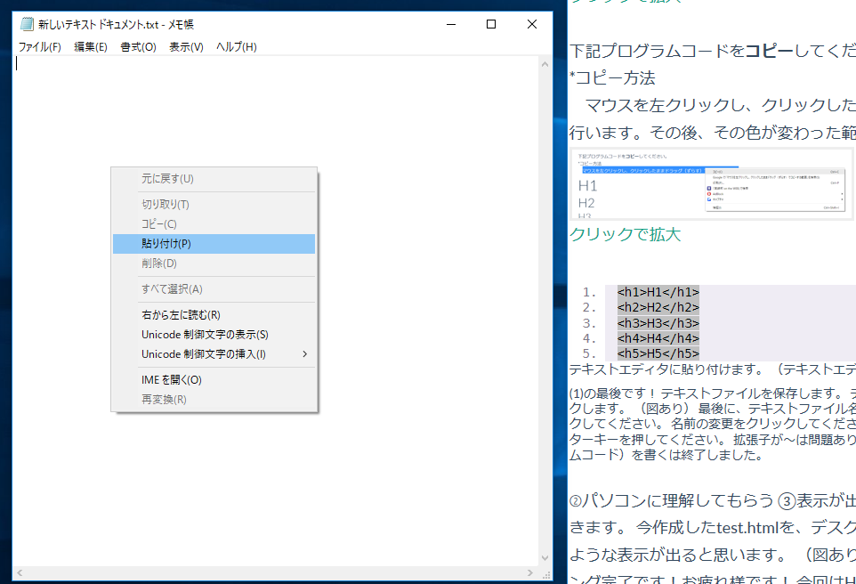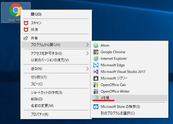 デスクトップ画面のtest.htmlを右クリックし、プログラムから開くをクリックし、メモ帳をクリックしてください。