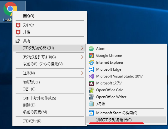 今作成したtest.htmlを、デスクトップ画面で左クリックします。