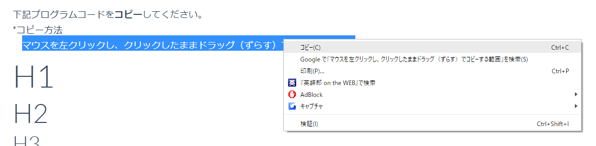 マウスを左クリックし、クリックしたままドラッグ(ずらす)でコピーする範囲の選択を行います。その後、その色が変わった範囲上で右クリックをし、コピーを選択します。