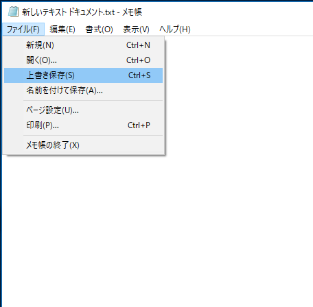 テキストエディタ左上のファイルをクリックし、上書き保存をクリックします。
