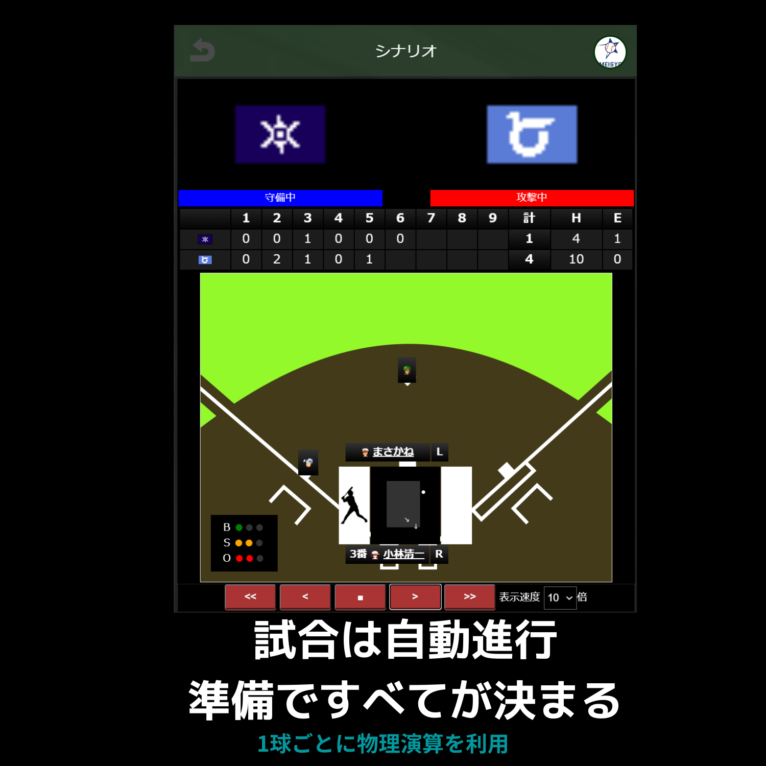 - データ野球を 投球・打撃・守備に物理演算を採用した試合と充実したデータ。